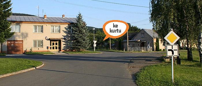 Projedete prudkou pravou zatáčku u hospody a přejedete železniční trať. Dostanete se na křižovatku u žluté budovy obecního úřadu. Cestou vpravo od budovy obecního úřadu se asi po sto metrech stoupání dostanete k tenisovému areálu.